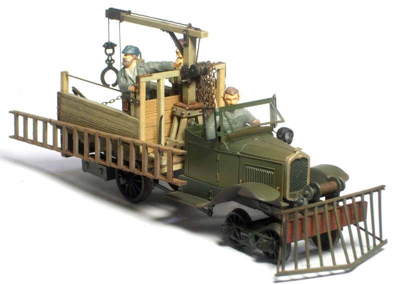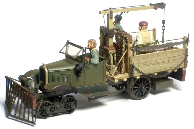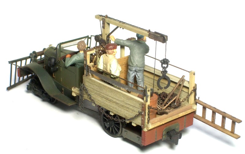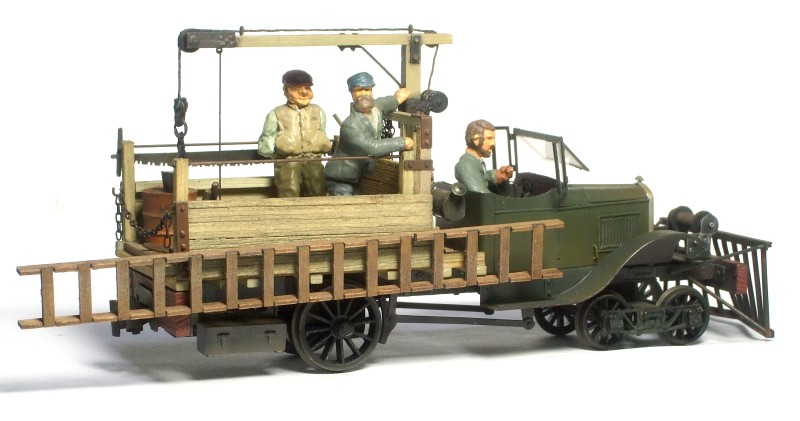 組み立て後、荷台の横にレーザーカット製(Banta製)の梯子を取り付け、この手の車輌ではお決まりの鎖を適当に配置し、最後に運転手(Milepost製)と作業員2人(Flying Zoo、Milepost製)を配置しました。 | ||